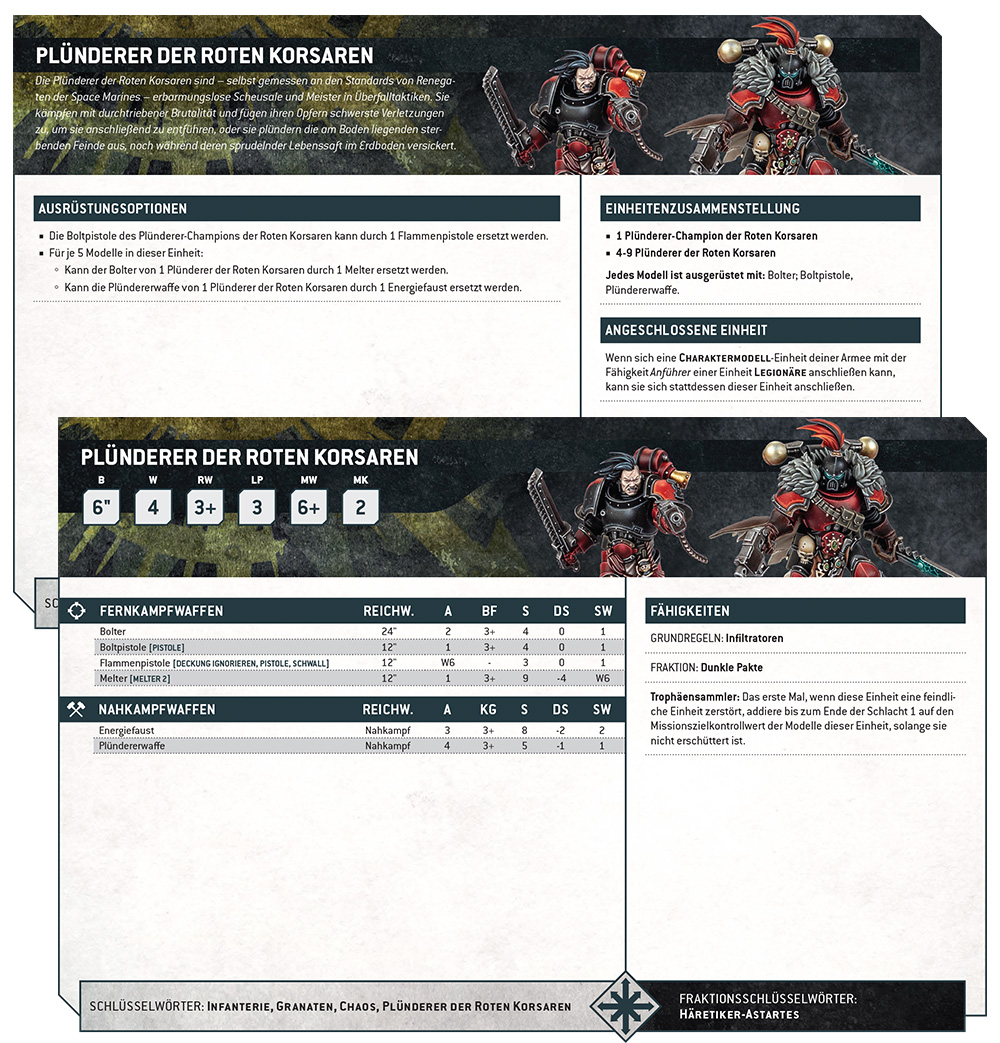 Die Plünderer der Roten Korsaren sind Meister darin, schnell zuzuschlagen und sich wertvollen Plunder zu greifen. Mit der Regel Infiltratoren können sie vorab eine gute Position einnehmen und mit einem respektablen MK von 2 können sie im Niemandsland Missionsziele halten. Anders als vergleichbare Vorhut-Truppen, die es eher vorziehen würden, vergessen und übersehen zu werden, können es die Korsaren kaum erwarten, sich in den Kampf zu stürzen. Nachdem sie frisches Blut vergossen haben, werden sie nur noch besser darin, Missionsziele zu verteidigen.