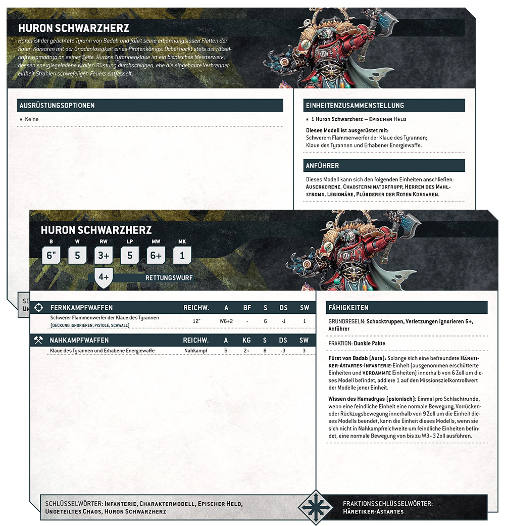 Huron Schwarzherz ist ein herausragender Krieger mit Jahrhunderten Erfahrung im Kampf gegen die Vielzahl der Schrecken, die den Mahlstrom ihr Zuhause nennen. Dazu gehören auch seine eigenen Krieger. Mit einem Nahkampfprofil, das auch Terminatoren mühelos entzwei reißt, wird er allen Erwartungen gerecht. Der kompakte Schwere Flammenwerfer, der in seiner Klaue des Tyrannen eingearbeitet ist, hat außerdem die Eigenschaft Pistole. Er kann also seine eindrucksvolle Kampfphase auf Piratenart mit einem überraschenden Feuerstoß ins Gesicht beginnen.