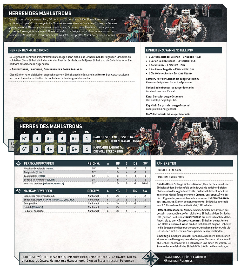 Du kannst diese neuen Datenblätter und die Kontingentsregeln für die Roten Korsaren bald in einem Update für das Fraktionspaket der Chaos Space Marines finden, das du auf der Warhammer-Community-Webseite herunterladen kannst. Huron und seine Mannschaft erscheinen in ein paar Wochen als Vorbestellungen, halte also ein Auge auf die Warhammer Community, um mehr zu erfahren!