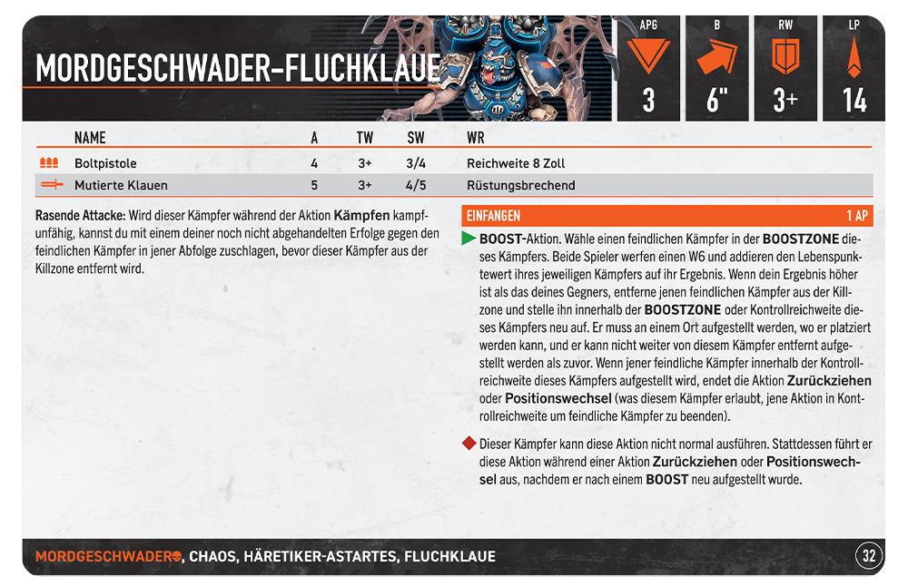 Über hinderliches Gelände und Gefahren am Boden springen zu können, ist an und für sich schon eine großartige Fähigkeit. Diese unglaublich fähigen Chaos Space Marines sind aber schnell genug, um allerlei Dinge im Flug auszuführen, sogenannte Boost-Aktionen. Der Bereich, den sie beim Boost überqueren, nennt sich Boostzone und jeder darin, der nicht gerade unter Aussichtspunkt-Gelände steht, kann sich auf unschöne Überraschungen gefasst machen.