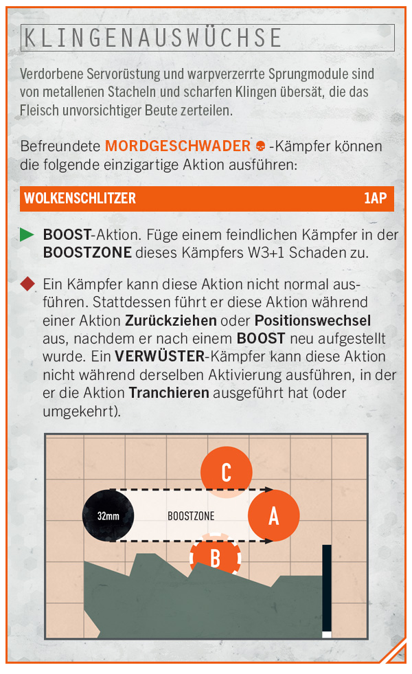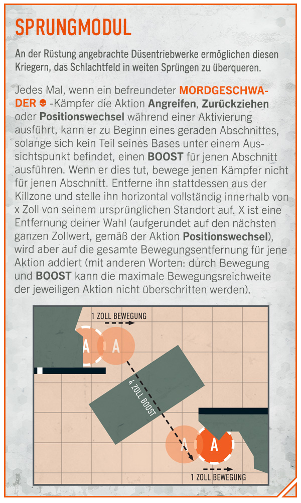 Jedes Mal, wenn ein befreundeter MORDGESCHWADER -Kämpfer die Aktion Angreifen, Zurückziehen oder Positionswechsel während einer Aktivierung ausführt, kann er zu Beginn eines geraden Abschnittes, solange sich kein Teil seines Bases unter einem Aussichtspunkt befindet, einen BOOST für jenen Abschnitt ausführen.