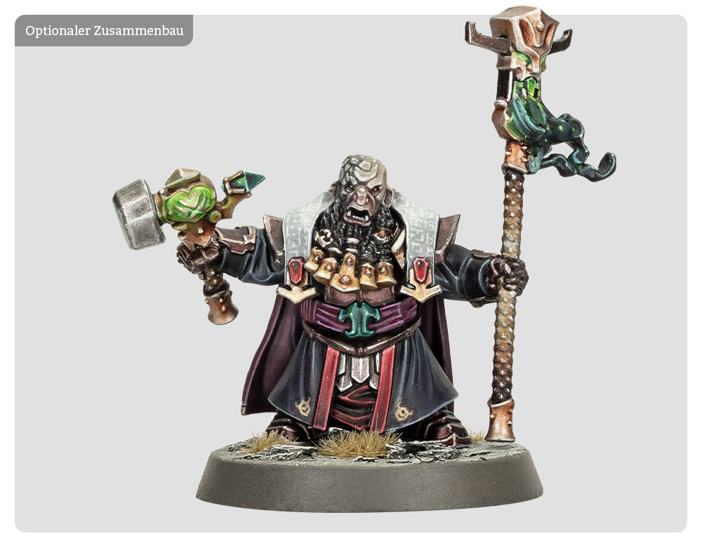 Alternativ kannst du aus diesem Bausatz einen Aschgrauen Ältesten bauen. Diese Priester beschwören im Kampf den Zorn des Stiervaters und gehen sicher, dass ihre Anhänger angemessenen Fanatismus zeigen. Helschmiede, die dem nicht nachkommen, werden mit diesen strengen Klerikern noch ihr blaues Wunder erleben.