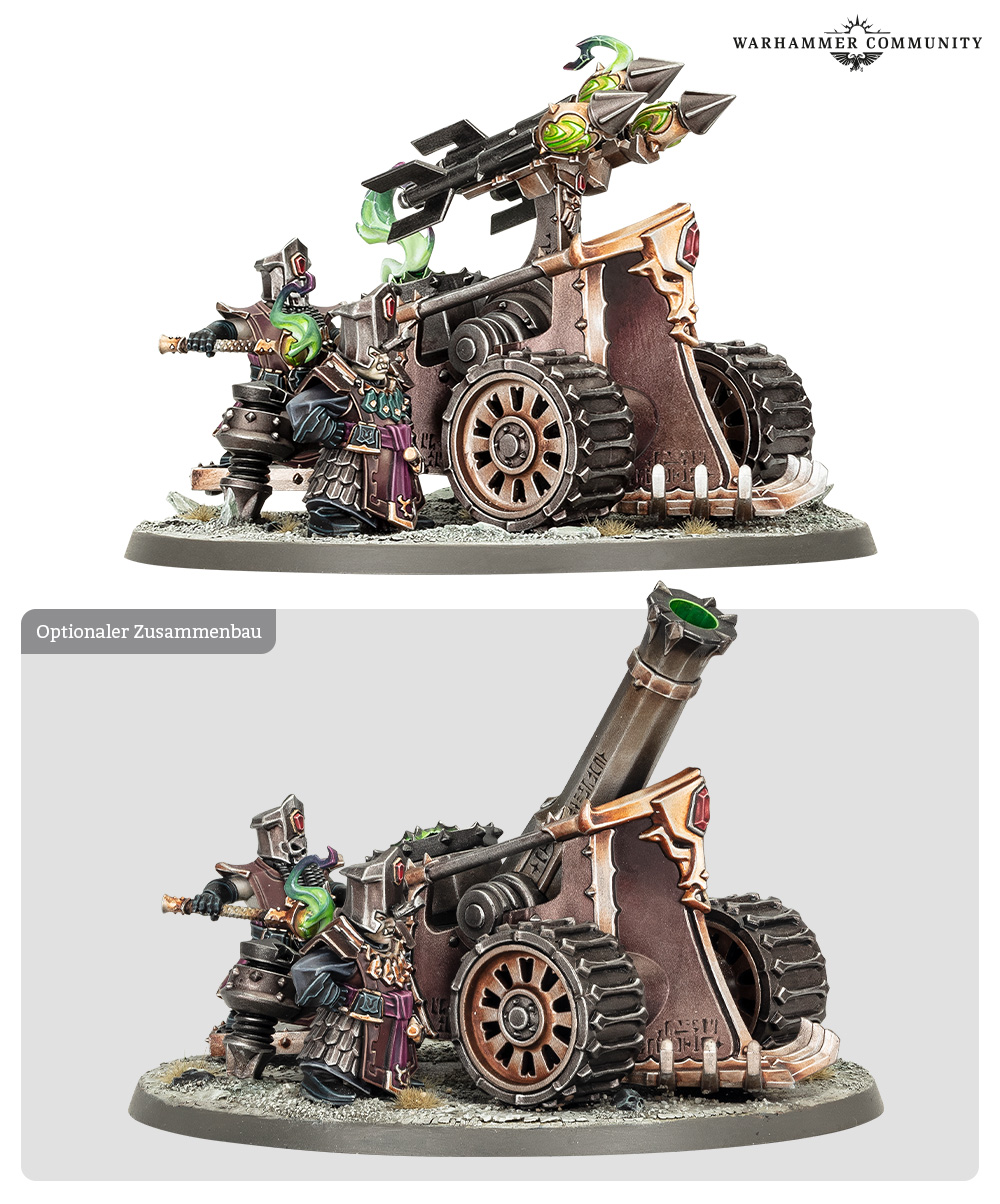 Aus dem Bausatz kannst du auch eine Peinigerbombarde bauen, welche rohe Chaosessenz als Munition verschießt und feindliche Formationen mit tödlichen Explosionen auslöscht. Jede Kriegsmaschine wird von einer Artilleriemannschaft begleitet. Das Set enthält zudem einen Abziehbilderbogen der Helschmiede des Hashut mit 450 Abziehbildern.
