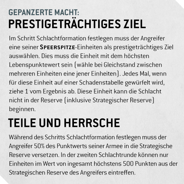 Im Schritt Schlachtformation festlegen muss der Angreifer eine seiner Speerspitze-Einheiten als prestigeträchtiges Ziel auswählen. Dies muss die Einheit mit dem höchsten Lebenspunktewert sein (wähle bei Gleichstand zwischen mehreren Einheiten eine jener Einheiten). Jedes Mal, wenn für diese Einheit auf einer Schadenstabelle gewürfelt wird, ziehe 1 vom Ergebnis ab. Diese Einheit kann die Schlacht nicht in der Reserve (inklusive Strategischer Reserve) beginnen.