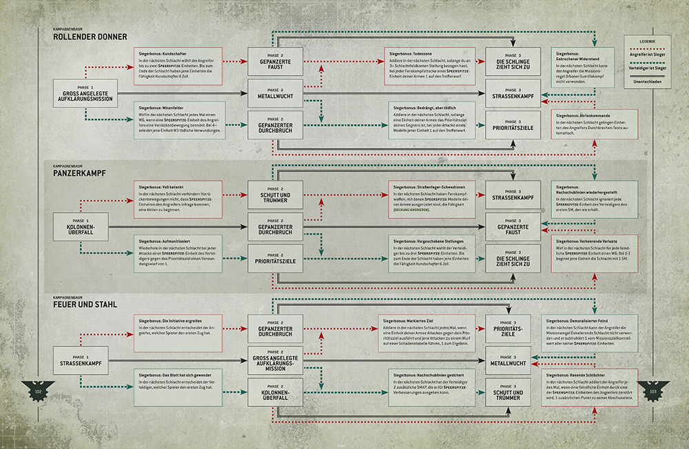 Schließlich enthält das Buch den Rahmen für kurze Gepanzerte-Macht-Kampagnen, die eine Reihe von Missionen durchschreiten, bei denen Panzerasse und berüchtigte Monster immer mehr Tötungen sammeln und mehr und mehr Verbesserungen erhalten. Drei separate Kampagnenbäume geben dir jede Menge Wiederspielwert, da Siege und Niederlagen Modifikatoren für spätere Spiele beeinflussen können. Ein plötzlicher Aufstieg oder Fall einer Seite kann völlig verändern, welche Missionen gespielt werden.