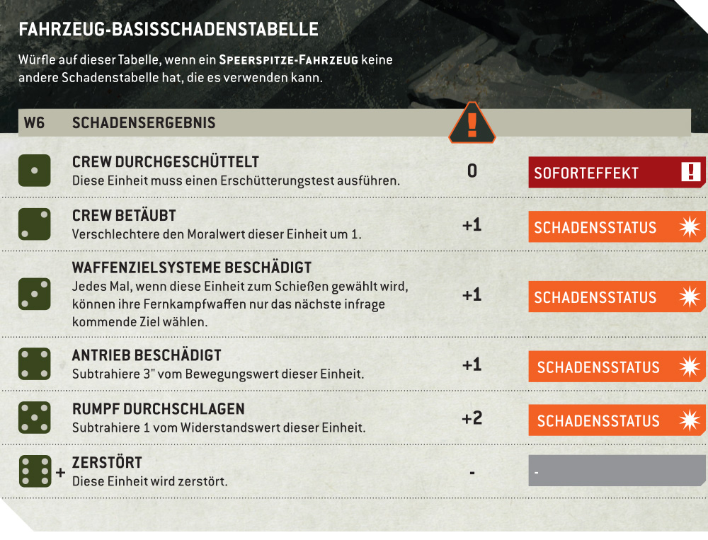 Speerspitze-Einheiten sind in Gepanzerte-Macht-Spielen ein ganzes Stück zäher als eine einfache Metallkiste. Wenn sie also ihren letzten ungeretteten Lebenspunkt verlieren, würfeln sie auf einer (fast) neuen* Tabelle, um zu sehen, was passiert, anstatt einfach zerstört zu werden. Manche Regeln verpassen ihnen auch noch Schadensmarker, die zum Wurf addiert werden und so die Wahrscheinlichkeit erhöhen, dass dein Fahrzeug in einem spektakulären Feuerball aufgeht.