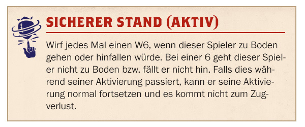 Wirf jedes Mal einen W6, wenn dieser Spieler zu Boden gehen oder hinfallen würde. Bei einer 6 geht dieser Spieler nicht zu Boden bzw. fällt er nicht hin. Falls dies während seiner Aktivierung passiert, kann er seine Aktivierung normal fortsetzen und es kommt nicht zum Zugverlust.