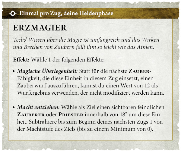 Erzmagier Teclis mag zwar nach seiner fulminanten Schlacht mit Nagash vor Ewigkeiten geschwächt sein, doch wie auch der Oberste Herrscher der Untoten ruht er sich nicht auf seinem Erfolg aus.** Die Skaven-Bedrohung lauert unter den Reichen und Teclis hat seine Herangehensweise an die Kriegsführung angepasst. Der Erzmagier kann wählen, ob er mit Magischer Überlegenheit einen Zauber mit einem nicht modifizierbaren Wert von 12 als Wurfergebnis wirken, oder mit Macht entziehen die Machtstufe eines Zauberers oder Priesters in seiner Nähe um 1 reduzieren will.