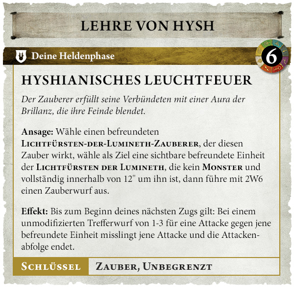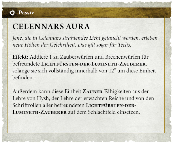 Effekt: Addiere 1 zu Zauberwürfen und Brechenwürfen für befreundete Lichtfürsten-der-Lumineth-Zauberer, solange sie sich vollständig innerhalb von 12" um diese Einheit befinden.
