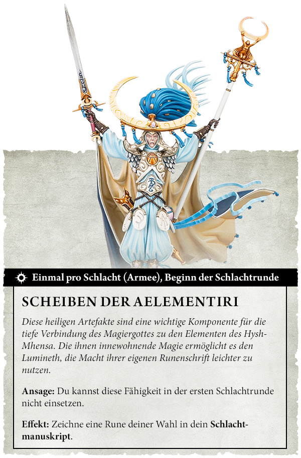 Indem er die Macht der Scheiben der Aelementiri an seinem Gürtel nutzt, kann Teclis auch wählen, eine zusätzliche Rune des Hysh-Mhensa in dein praktisches neues Schlachtmanuskript zu zeichnen. Ab der zweiten Schlachtrunde hast du zu Beginn einer jeden Schlachtrunde einmal im Spiel die Gelegenheit, eine zusätzliche Rune zu zeichnen. Runen, die auf diese Art gezeichnet wurden, lösen nicht den Teil Rune zeichnen der Fähigkeit aus, also wählst du keine Einheit, die du stärkst. Andere Runen, die gezeichnet werden, werden jedoch in ihrer Wirkung verstärkt. Das ist ganz schön potentes Zeug für jene, die gewillt sind, ihre Geister zu erweitern und mehr darüber zu lernen, wie die fünf Runen miteinander harmonisieren.***