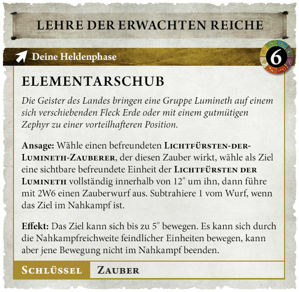 Ansage: Wähle einen befreundeten Lichtfürsten-der-Lumineth-Zauberer, der diesen Zauber wirkt, wähle als Ziel eine sichtbare befreundete Einheit der Lichtfürsten der Lumineth, die kein Monster und vollständig innerhalb von 12" um ihn ist, dann führe mit 2W6 einen Zauberwurf aus.