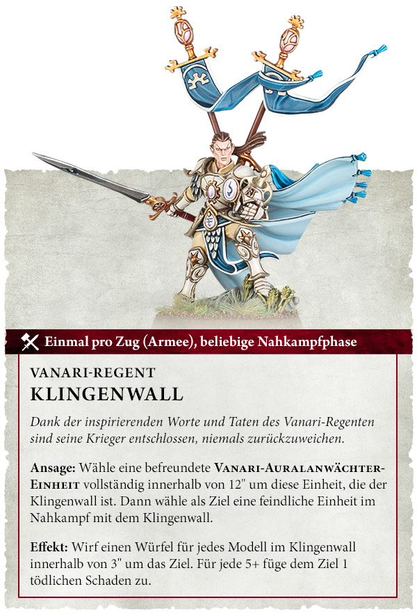 Ansage: Wähle eine befreundete Vanari-Auralanwächter-Einheit vollständig innerhalb von 12" um diese Einheit, die der Klingenwall ist. Dann wähle als Ziel eine feindliche Einheit im Nahkampf mit dem Klingenwall.