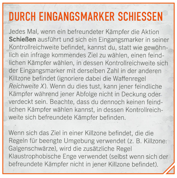 Jedes Mal, wenn ein befreundeter Kämpfer die Aktion Schießen ausführt und sich ein Eingangsmarker in seiner Kontrollreichweite befindet, kannst du, statt wie gewöhnlich ein infrage kommendes Ziel zu wählen, einen feindlichen Kämpfer wählen, in dessen Kontrollreichweite sich der Eingangsmarker mit derselben Zahl in der anderen Killzone befindet (ignoriere dabei die Waffenregel Reichweite X). Wenn du dies tust, kann jener feindliche Kämpfer während jener Abfolge nicht in Deckung oder verdeckt sein. Beachte, dass du dennoch keinen feindlichen Kämpfer wählen kannst, in dessen Kontrollreichweite sich befreundete Kämpfer befinden.