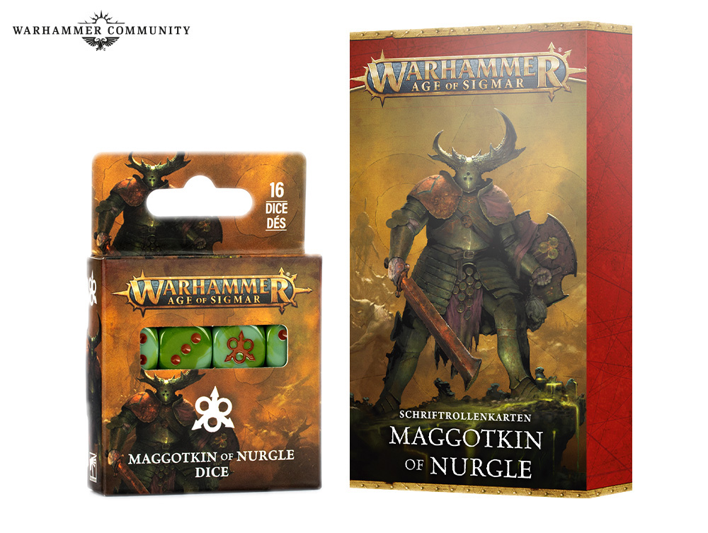 Schriftrollenkarten und Würfelset der Madensippe des Nurgle