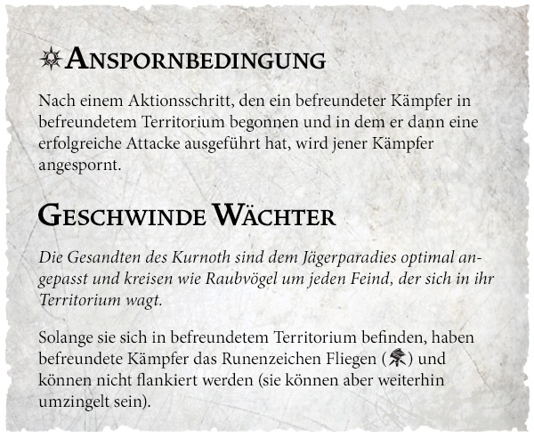 Die Gesandten des Kurnoth sind fest entschlossen, Feinde mit allem, was nötig ist, aus ihrem Reich zu jagen. Passenderweise ist ihre Anspornbedingung erfüllt, wenn sie eine erfolgreiche Attacke in einem Aktionsschritt ausführen, den sie im befreundeten Territorium begonnen haben. So hast du die Wahl, entweder festgewurzelt deine Heimat zu verteidigen, oder losstürmen, um Angreifer zu bestrafen.