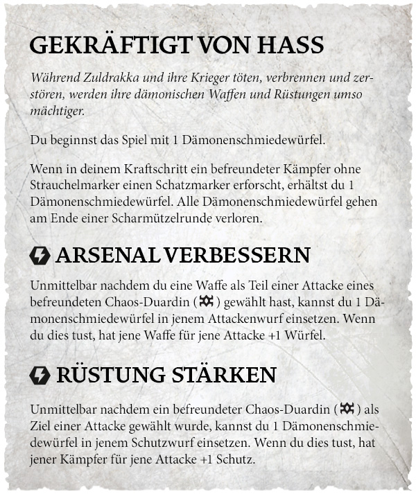 Die Helschmiede vernichten das Land und ziehen dann daraus Macht, um ihre dämonischen Waffen zu verstärken, was in Warhammer Underworlds nicht anders ist. Nach der Erniedrigung durch die Kurnothi sind sie Gekräftigt von Hass. Sie erhalten jedes Mal, wenn sie einen Schatzmarker erforschen, einen Dämonenschmiedewürfel. Diese können dann für eine von zwei Aktionen ausgegeben werden: Arsenal verbessern lässt dich beim Attackenwurf eines Chaos-Duardin einen Würfel mehr werfen, und Rüstung stärken erhöht den Schutzwurf um 1 Schutz.