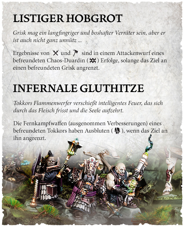 Ergebnisse von und sind in einem Attackenwurf eines befreundeten Chaos-Duardin ( ) Erfolge, solange das Ziel an einen befreundeten Grisk angrenzt.