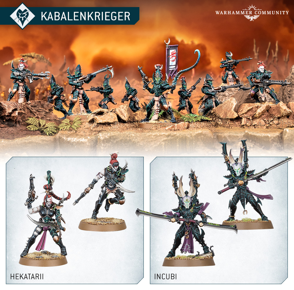 Die Kampfpatrouille gibt dir einen guten Kern um die Haemonculus-Zirkel, also ist der nächste logische Schritt ein Ausbau mit einigen Kabalen- und Hekatarii-Kult-Einheiten. Die Kabalenkrieger sind das Rückgrat vieler Plünderzüge und können eine vernichtende Masse von Feuerkraft mit ihren vergifteten Splittergewehren aufbringen, die besonders Infanterie hart treffen. Sie können die mächtigen Custodes ebenso wie einen gewöhnlichen Soldaten genauso verwunden.