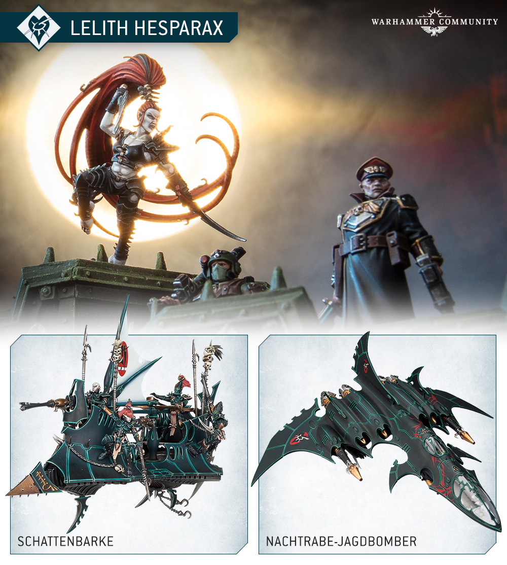 Nur wenige ambitionierte Drukhari können es ohne ein Messer in ihrem Rücken zur Spitze von Commorraghs Nahrungskette empor arbeiten. Jene Namen, die überall in der Dunklen Stadt bekannt sind, gehören daher zu wahrlich außergewöhnlichen Individuen. Individuen wie etwa Lelith Hesparax, eine Gladiatorin von so legendärer Tödlichkeit, dass sie als die Königin der Messer bekannt ist. Sie ist eine fantastische Anführerin für deine Hekatarii und extrem tödlich für gegnerische Charaktermodelle, die schneller ein Messer in ihrer Halsvene finden werden, als sie reagieren können.