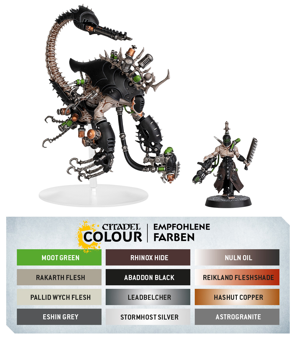 Drukhari-Miniaturen zeigen auch oft eine Kombination aus schlanken, scharfen Rüstungsplatten mit aufgequollenem Fleisch, was zwei völlig verschiedene Texturen bedeutet. Die Fleischabscheulichkeiten der Haemonculus-Zirkel sind ein guter Startpunkt, um Bemaltechniken zu üben. Wenn du hier etwas Neues probierst und das Ergebnis etwas seltsam wirkt, dann ist das einfach Teil der Ästhetik!