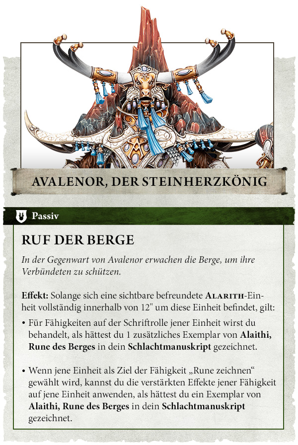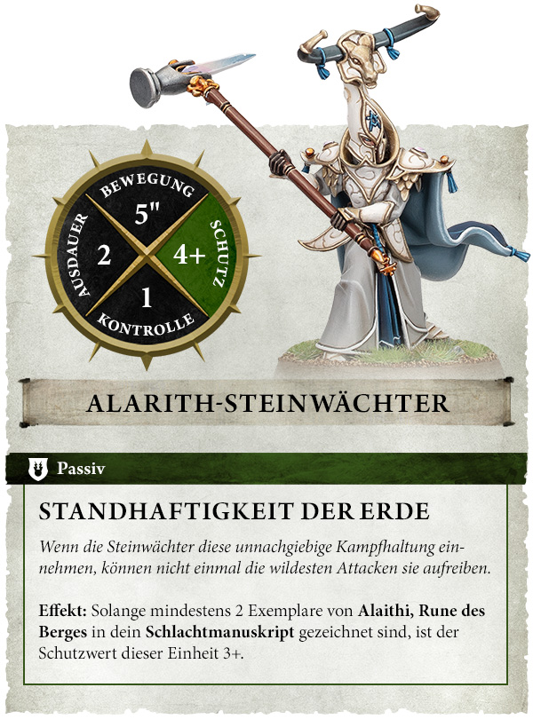 Effekt: Solange mindestens 2 Exemplare von Alaithi, Rune des Berges in dein Schlachtmanuskript gezeichnet sind, ist der Schutzwert dieser Einheit 3+.