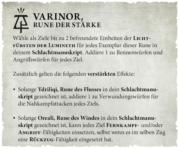 Wähle als Ziele bis zu 2 befreundete Einheiten der Lichtfürsten der Lumineth für jedes Exemplar dieser Rune in deinem Schlachtmanuskript. Addiere 1 zu Rennenwürfen und Angriffswürfen für jedes Ziel. Zusätzlich gelten die folgenden verstärkten Effekte: