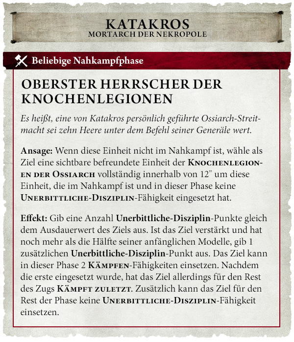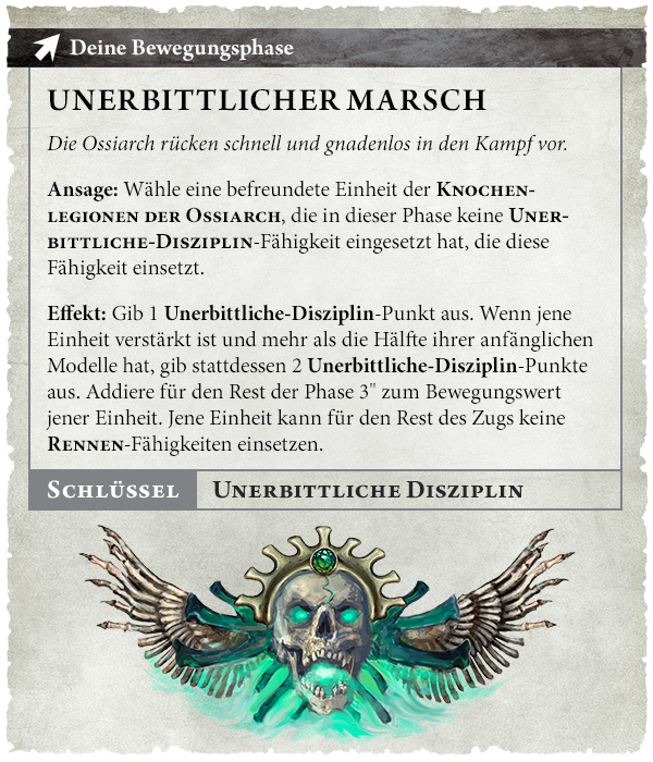 Ansage: Wähle eine befreundete Einheit der Knochenlegionen der Ossiarch, die in dieser Phase keine Unerbittliche-Disziplin-Fähigkeit eingesetzt hat, die diese Fähigkeit einsetzt.