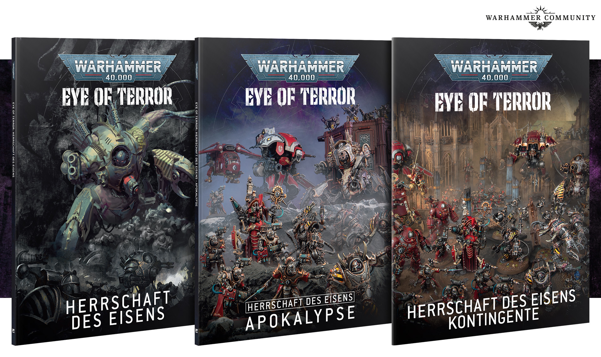 Wie auch 500 Welten: Titus und Der Mahlstrom: Reich des Tyrannen erscheint Auge des Schreckens: Herrschaft des Eisens als ein Set Bücher im dekorativen Schuber. Das Set ergänzt die Hintergründe der neueren Konflikte des 41. Jahrtausends und fügt neue Spielregeln hinzu, um deine Schlachten zu verbessern. Das Buch „Herrschaft des Eisens“ umfasst die Vorbereitungen der Iron Warriors, um die standhaften Welten des Tors von Cadia anzugreifen. Dazu gehört ein umfassender Blick auf die vielen sterblichen und dämonischen Streitmächte unter dem Kommando von Kriegsschmied Kravek Morne.
