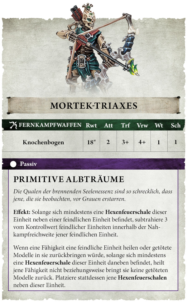 Für je 10 Mortek-Triaxes in einer Einheit schließen sich ihr zwei dreibeinige Hexenfeuerschalen an. Wenn alle Triaxes die gleiche Einheit attackieren, kannst du eine Hexenfeuerschale neben jene Einheit platzieren, um das Trauma zu markieren, dass die Seelen verbrennende Essenz hinterlässt, die die Pfeile umgibt. Diese fürchterliche und geisterhafte Flamme verursacht bei ihren Zielen Primitive Albträume, die ihren Kontrollwert um 3 reduzieren. Dieser Effekt schlägt auch auf Einheiten innerhalb von 3 Zoll von ihnen über. Die Flammen können nur von Heilfähigkeiten gelöscht werden, die die Einheit dann aber nicht heilen oder erschlagene Modelle zurückholen können.