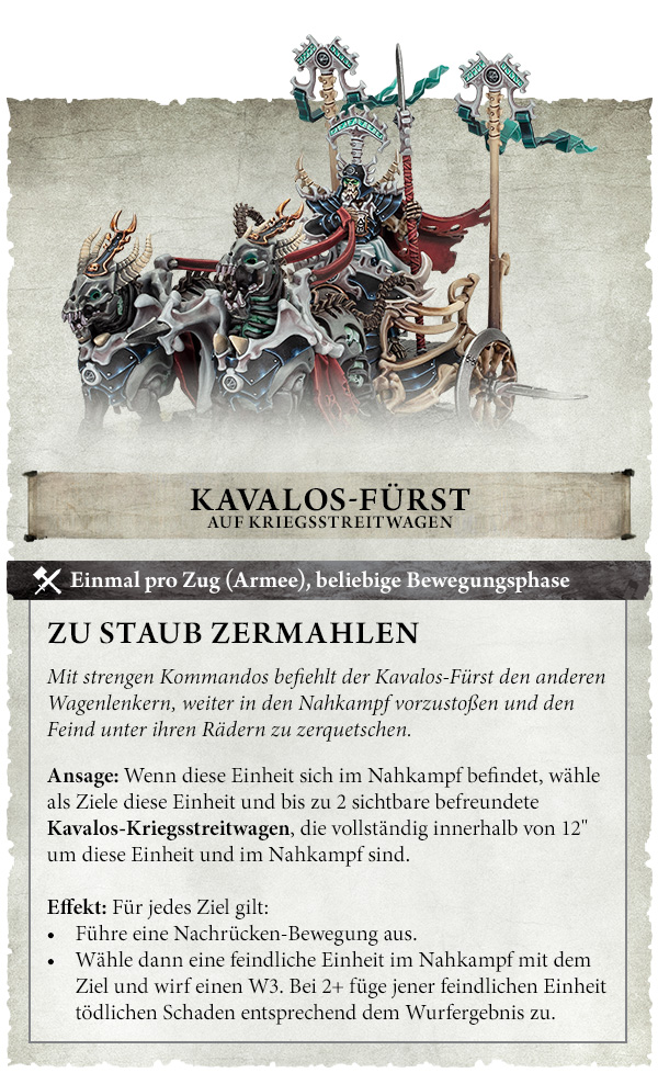 Mit dem Befehl Zu Staub zermahlen können Kavalos-Fürsten mit zwei weiteren Wagenlenkern in der Bewegungsphase eine Nachrücken-Bewegung durchführen und dabei noch tödlichen Schaden austeilen. Die Kriegsstreitwagen selbst sind für Sensenangriffe ausgelegt und teilen Schaden aus, wenn sie feindliche Einheiten angreifen. Sie können außerdem durch Verteidigungslinien brechen (was du darstellst, indem du das Modell vom Spielfeld nimmst und im Kampf wieder aufstellst). Ihre Feinde sind nach Wurfspeerattacken oft Festgesetzt. Das wird nicht mit einem Waffenprofil, sondern mit einer Fähigkeit dargestellt, die bei einem Wurf von 3+ aktiviert wird, 1 tödlichen Schaden austeilt und die anvisierte Einheit für den Rest der Schlachtrunde daran hindert, Nachrücken-Bewegungen durchzuführen.
