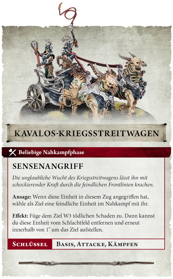 Ansage: Wenn diese Einheit sich im Nahkampf befindet, wähle als Ziele diese Einheit und bis zu 2 sichtbare befreundete Kavalos-Kriegsstreitwagen, die vollständig innerhalb von 12" um diese Einheit und im Nahkampf sind.