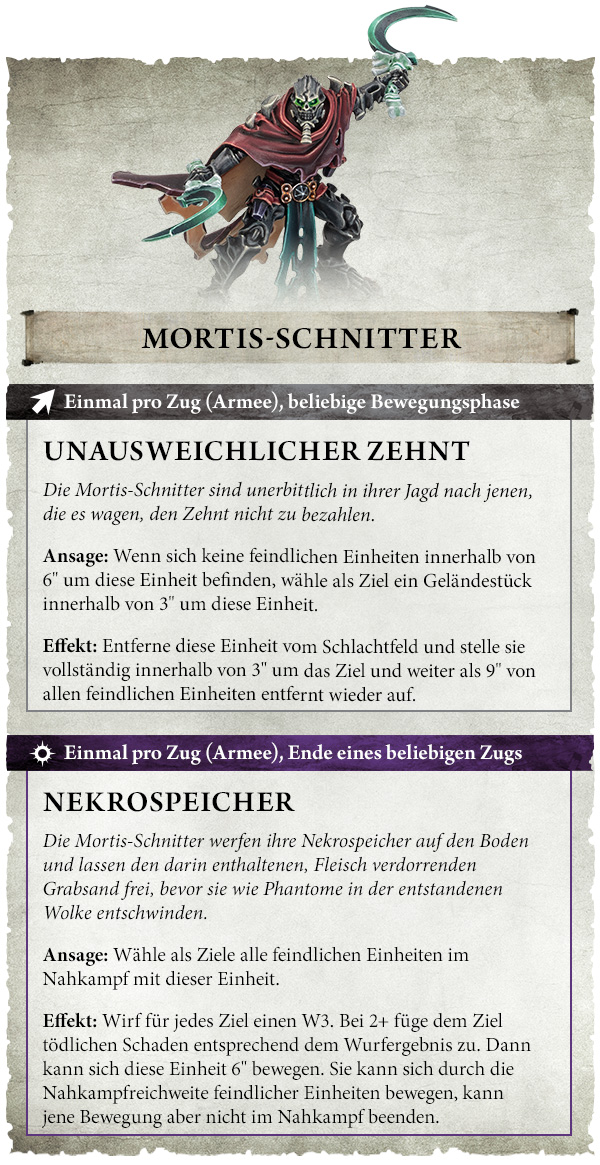 Die Mortis-Schnitter sind der genaue Gegensatz zu diesen lauten Kriegsmaschinen. Sie sind tödliche Assassinen, die mit furchterregender Synchronität arbeiten. Niemand kann ihnen und ihrer Fähigkeit Unausweichlicher Zehnt entkommen. Sie verschwinden in den Schatten und Winkeln des Geländes, um dann an einem völlig anderen Ort wieder aufzutauchen. Wir benutzen ja lieber Türen, aber das hat natürlich nicht so viel Stil. Sie haben alle ein paar Nekrospeicher bei sich. Zerbricht man diese Geräte, entfesseln sie Wolken aus Grabsand, die allem die Feuchtigkeit entziehen und ihrem Ziel tödlichen Schaden verursachen. So können die Mortis-Schnitter rasch mit ihren Taschen voller Knochen verschwinden.