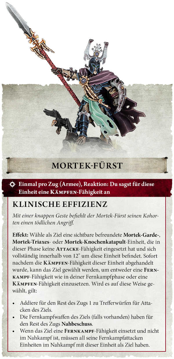 Effekt: Wähle als Ziel eine sichtbare befreundete Mortek-Garde-, Mortek-Triaxes- oder Mortek-Knochenkatapult-Einheit, die in dieser Phase keine Attacke-Fähigkeit eingesetzt hat und sich vollständig innerhalb von 12" um diese Einheit befindet. Sofort nachdem die Kämpfen-Fähigkeit dieser Einheit abgehandelt wurde, kann das Ziel gewählt werden, um entweder eine Fernkampf-Fähigkeit wie in deiner Fernkampfphase oder eine Kämpfen-Fähigkeit einzusetzen. Wird es auf diese Weise gewählt, gilt: