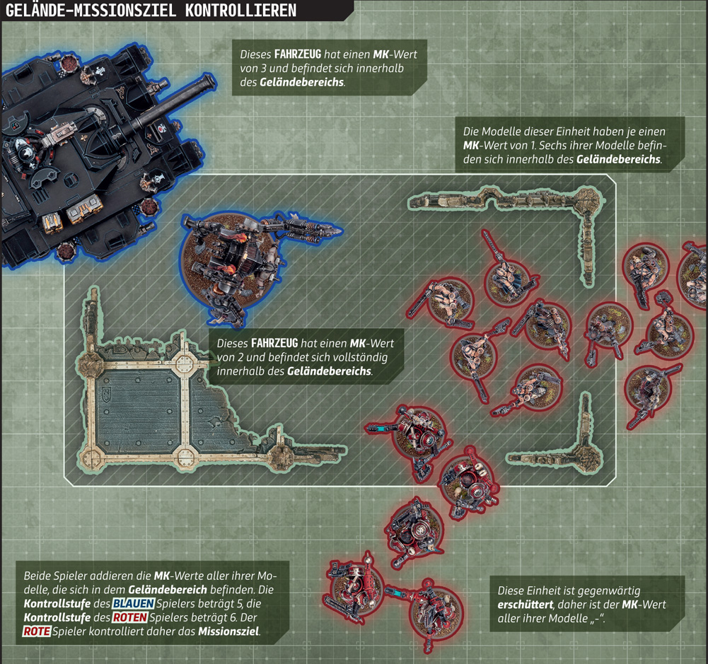 Anstelle von Markern, neben denen Einheiten stehen müssen, werden die meisten Missionsziele jetzt gesichert, indem ein Geländebereich* eingenommen wird. Das klingt vielleicht wie eine einfache Änderung, hat aber einige Auswirkungen darauf, wie du an den Kampf um Missionsziele herangehst.