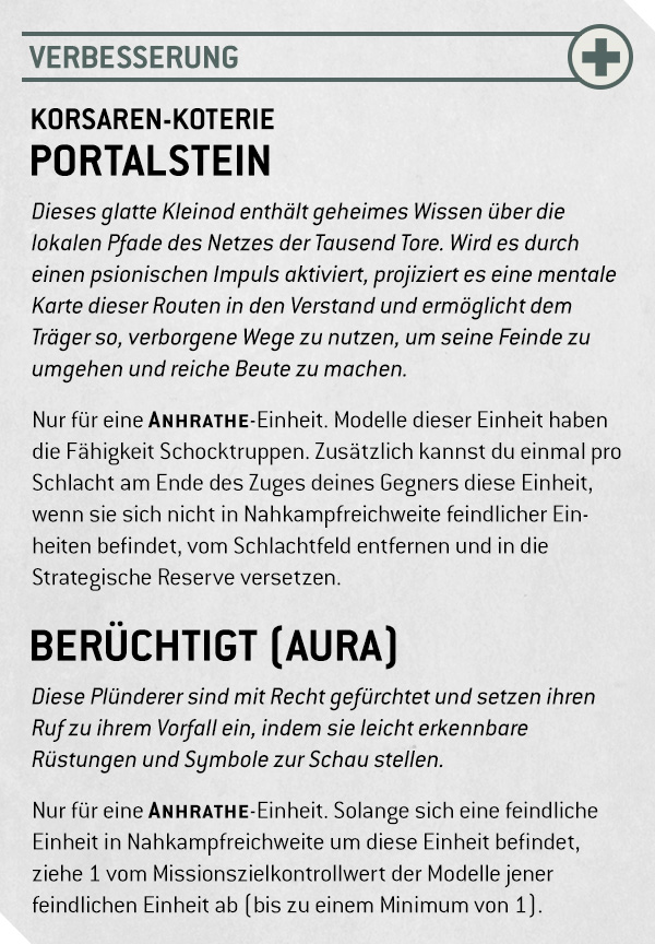Korsarenverbesserungen zeigen, wie elitär diese Piratencrews sind, indem sie ganze Einheiten so verbessern, wie es einem Charaktermodell würdig wäre. Der Portalstein verleiht einer beliebigen Anhrathe-Einheit Schocktruppen, was nur in spaßigen Tricksereien enden kann. Berüchtigt macht deine Standardeinheiten zu Spezialisten darin, Missionsziele aus den Fingern derer zu stehlen, die sie nicht verdient haben.