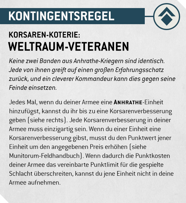 Jedes Mal, wenn du deiner Armee eine Anhrathe-Einheit hinzufügst, kannst du ihr bis zu eine Korsarenverbesserung geben (siehe rechts). Jede Korsarenverbesserung in deiner Armee muss einzigartig sein. Wenn du einer Einheit eine Korsarenverbesserung gibst, musst du den Punktwert jener Einheit um den angegebenen Preis erhöhen (siehe Munitorum-Feldhandbuch). Wenn dadurch die Punktkosten deiner Armee das vereinbarte Punktlimit für die gespielte Schlacht überschreiten, kannst du jene Einheit nicht in deine Armee aufnehmen.