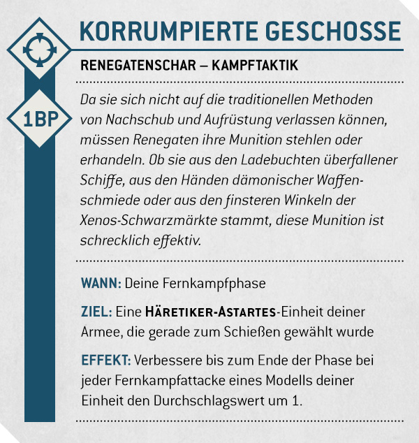 Renegaten ihre Munition stehlen oder erhandeln. Ob sie aus den Ladebuchten überfallener Schiffe, aus den Händen dämonischer Waffenschmiede oder aus den finsteren Winkeln der Xenos-Schwarzmärkte stammt, diese Munition ist schrecklich effektiv.