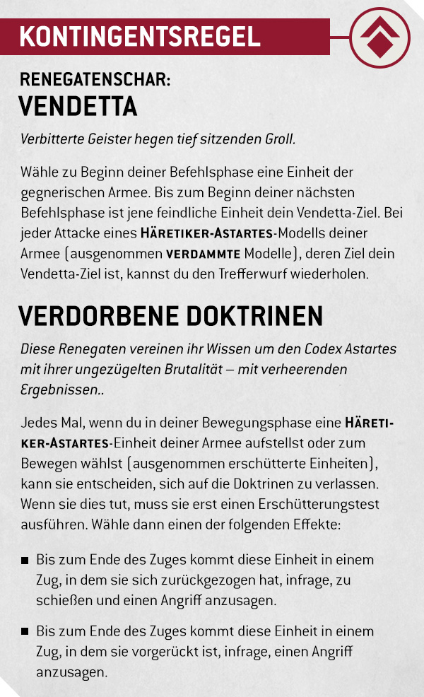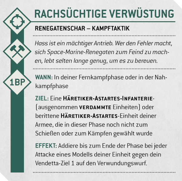 Wähle zu Beginn deiner Befehlsphase eine Einheit der gegnerischen Armee. Bis zum Beginn deiner nächsten Befehlsphase ist jene feindliche Einheit dein Vendetta-Ziel. Bei jeder Attacke eines Häretiker-Astartes-Modells deiner Armee (ausgenommen verdammte Modelle), deren Ziel dein Vendetta-Ziel ist, kannst du den Trefferwurf wiederholen.
