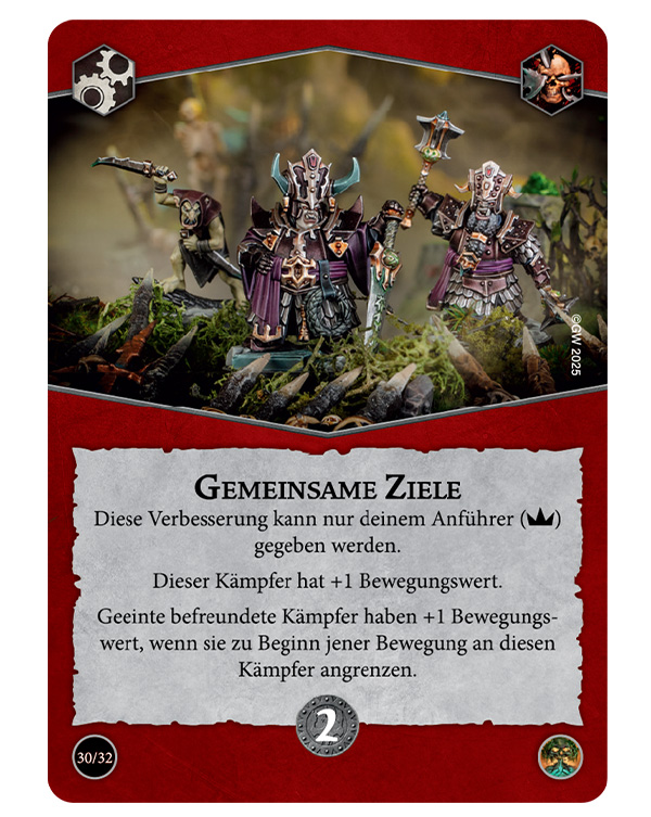 Geeinte befreundete Kämpfer haben +1 Bewegungswert, wenn sie zu Beginn jener Bewegung an diesen Kämpfer angrenzen.