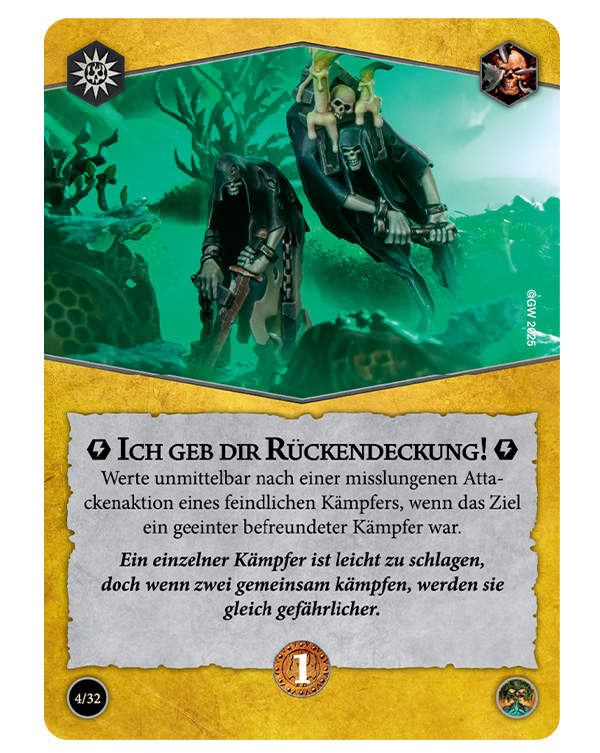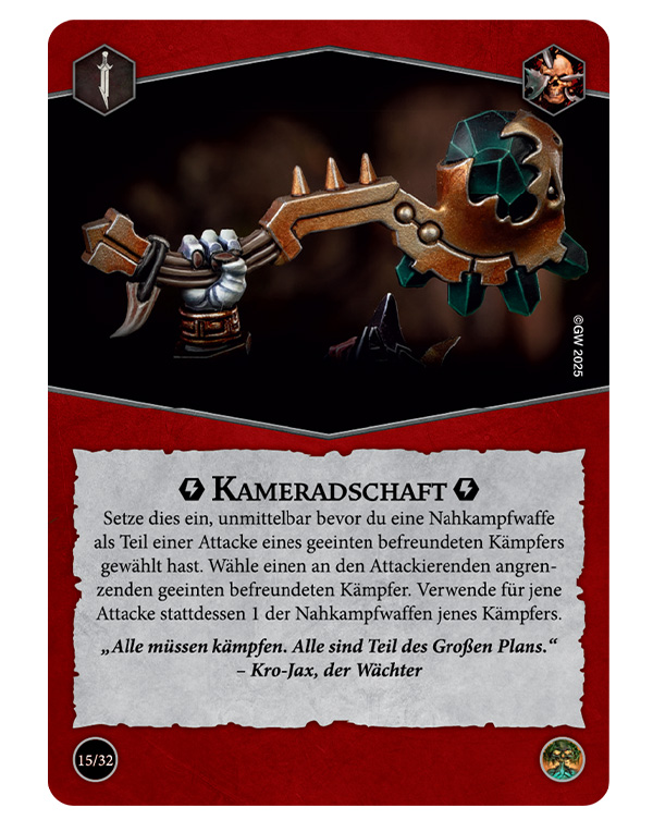 Mit Kameradschaft kannst du die Nahkampfwaffe eines angrenzenden befreundeten Kämpfers für eine Attacke wählen. Möglicherweise, um die Verbesserungswaffe Fesselschlag zu nutzen, die Spalten und Fesseln erhält, wenn ihr Ziel flankiert wird oder umzingelt ist. Im Deck sind auch Karten wie Tödliches Duo und Kriegstitan, mit denen du Kämpfer einen kannst, selbst wenn sie nicht aneinander angrenzen. Diese gilt es im Hinterkopf zu behalten, insbesondere, weil ein geeinter Kämpfer stets als flankierend gilt …