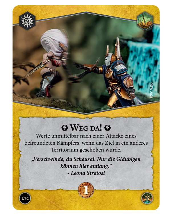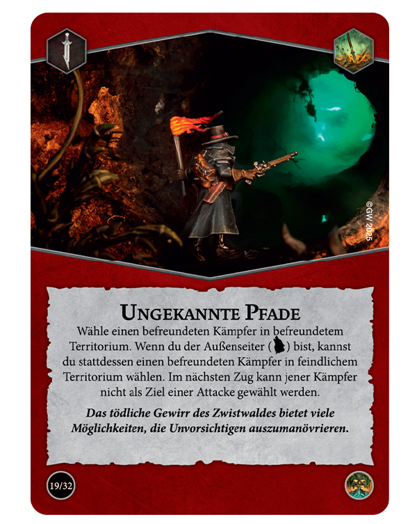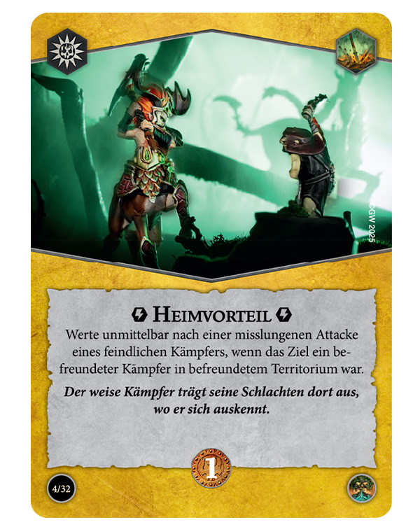 Deine Kriegerschar kann außerdem Invasoren abwehren, indem sie einen Hagel aus Schlägen entfesselt, wobei jeder befreundete Kämpfer +1 Attackenwürfel erhält, während er bei der Attacke auf befreundetem Territorium steht. Sie kann auch Ungekannte Pfade nutzen, um zu verhindern, dass sie das Ziel feindlicher Attacken wird. Als Außenseiter rettet sie sich so sogar auf dem feindlichen Territorium.