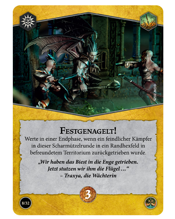 Werte in einer Endphase, wenn ein feindlicher Kämpfer in dieser Scharmützelrunde in ein Randhexfeld in befreundetem Territorium zurückgetrieben wurde.