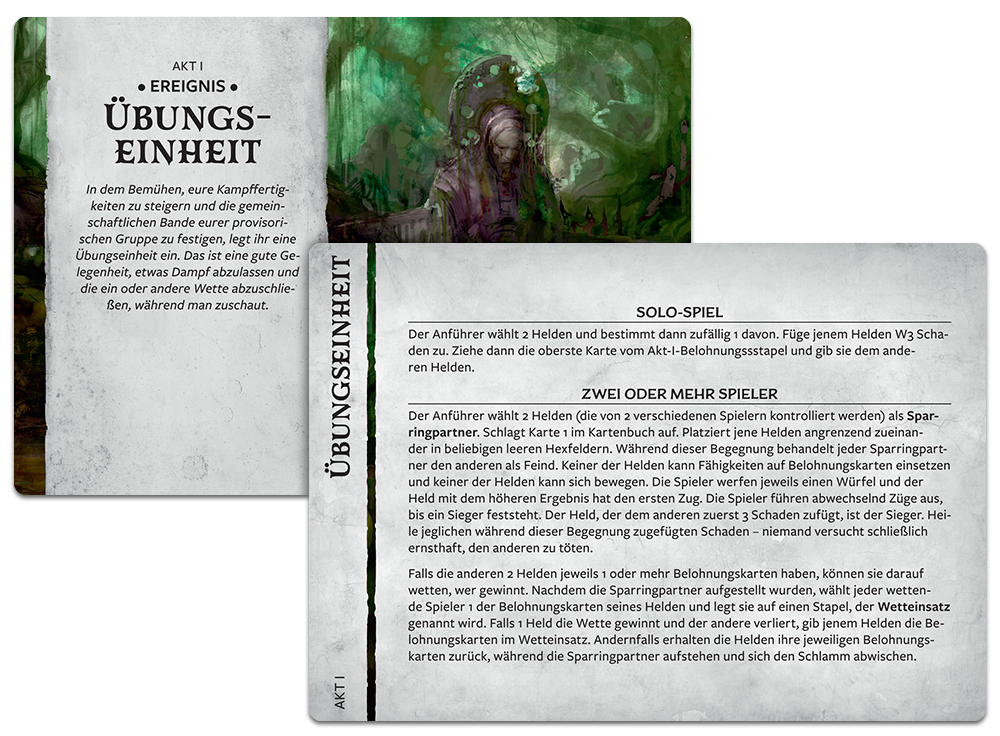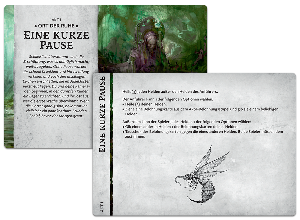 Diese Kampagnen sind spannende Abenteuer in drei Akten, die dich durch die infizierten Ruinen des Jadeklosters führen, in denen du mehrere Szenarien spielst, neue Helden und Belohnungen freischaltest und dich schließlich mit dem abstoßenden Gelgus Pust selbst misst. Der Sieg ist nicht garantiert, aber du solltest dich von einer Niederlage nicht abschrecken lassen! Kampagnen sind dafür ausgelegt, erneut gespielt zu werden. Und weil man in jedem Spiel nur einen Teil der möglichen Karten spielt, ist jede Partie eine neue und einzigartige Kombination der gespielten Helden, gekämpften Schlachten, überwundenen Ereignisse und geplünderten Schätze.