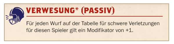 Für jeden Wurf auf der Tabelle für schwere Verletzungen für diesen Spieler gilt ein Modifikator von +1.