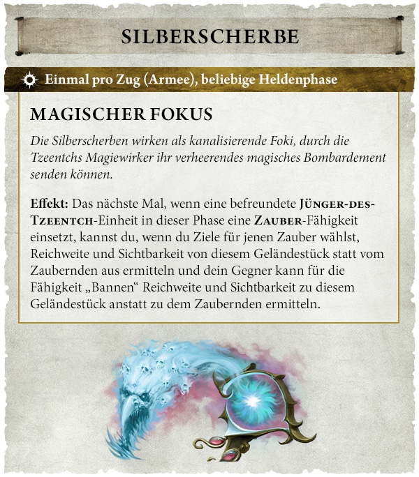 Einmal pro Zug kann ein Jünger-des-Tzeentch-Zauberer eine Silberscherbe als den Ausgangspunkt seines Zaubers wählen. Dadurch kannst du die Reichweite und Sichtbarkeit von der Silberscherbe aus messen, womit die potentielle Reichweite erhöht ist. Allerdings können feindliche Zauberer die Scherbe ebenso als Ziel für ihren Bannwurf wählen.