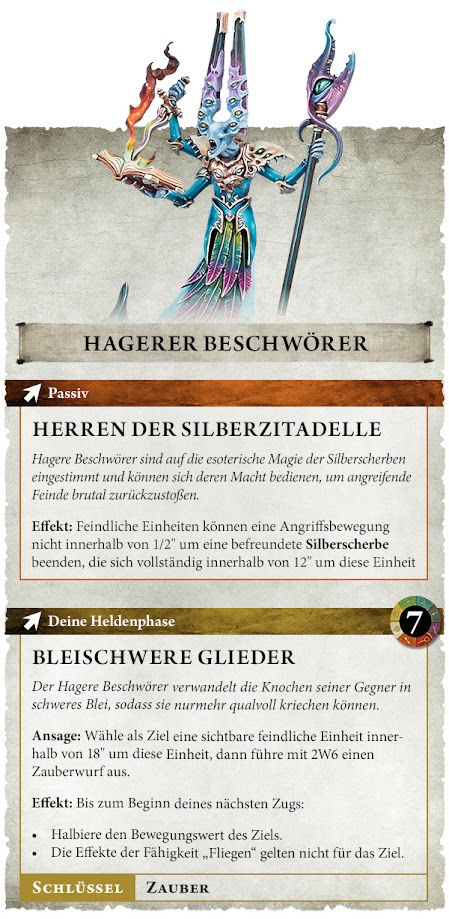 Als Herren der Silberzitadelle dürfte es auch keine Überraschung sein, dass Hagere Beschwörer auf die Silberscherben eingestimmt sind. Wenn sie in der Nähe sind, können sie feindliche Einheiten davon abhalten, ihre Angriffsbewegung innerhalb von ½” um die Silberscherben zu beenden. Hagere Beschwörer zu Fuß können auch auf andere Weise mit ihren Feinden spielen. Mit Bleischweren Gliedern können sie beispielsweise den Bewegungswert und Fliegen bei ihren Feinden einschränken.