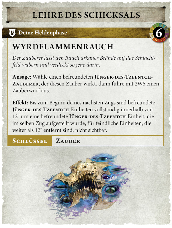 Ansage: Wähle einen befreundeten Jünger-des-Tzeentch-Zauberer, der diesen Zauber wirkt, dann führe mit 2W6 einen Zauberwurf aus.