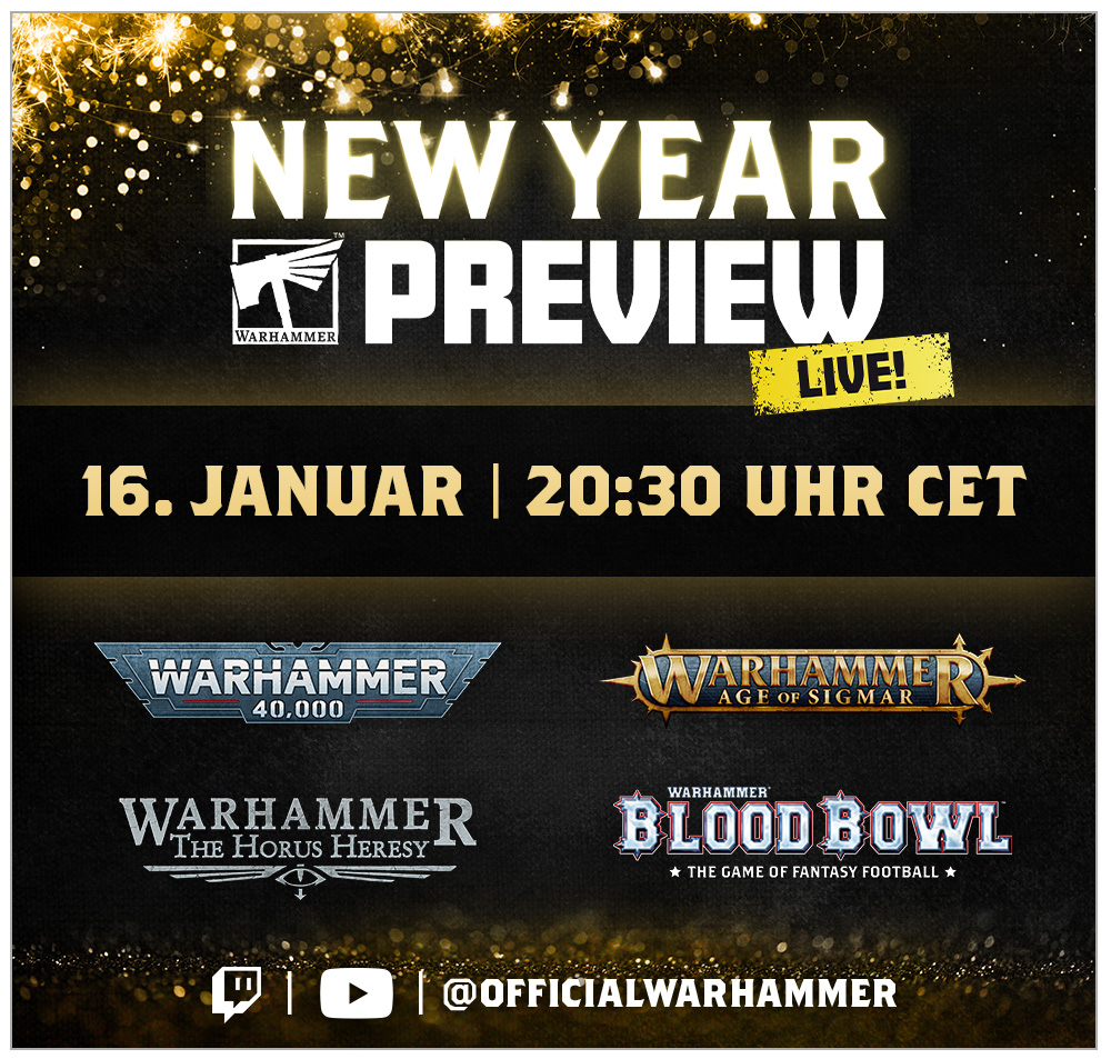 Die New Year Warhammer Preview Live! 2026 wird direkt hier aus der Warhammer World um die ganze Welt übertragen. Adam und Eddie sind unsere Moderatoren, die dich durch all die spannenden neuen Enthüllungen begleiten werden. Hast du bereits die sehr subtilen Hinweise im Video auf das gesehen, was kommen mag? Wir können bestätigen, dass die New Year Preview Warhammer 40.000, Warhammer Age of Sigmar, Warhammer: The Horus Heresy und Blood Bowl abdecken wird.