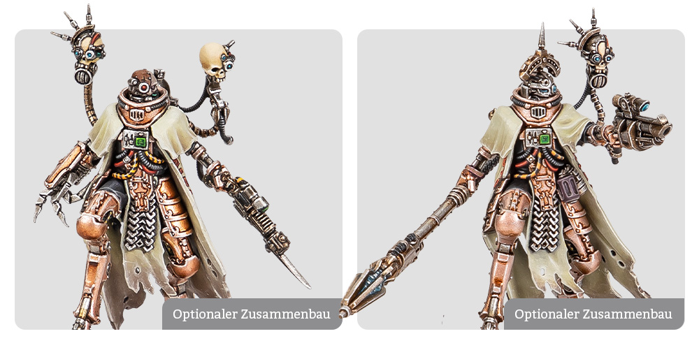 Sie können mit einer Auswahl esoterischer Waffen ausgestattet werden: Einer Voltschuss-Kurzwaffe oder einer Archaeotechpistole und einem Auktoritzepter, einer Phasenklaue oder einem Kondensatorstab. Sie können auch mit einem von drei Köpfen gebaut werden. Deine Marschalle können also unterschiedlich aussehen, wenn du deine Skitarii-Konklave mit mehr als einem anführen möchtest.