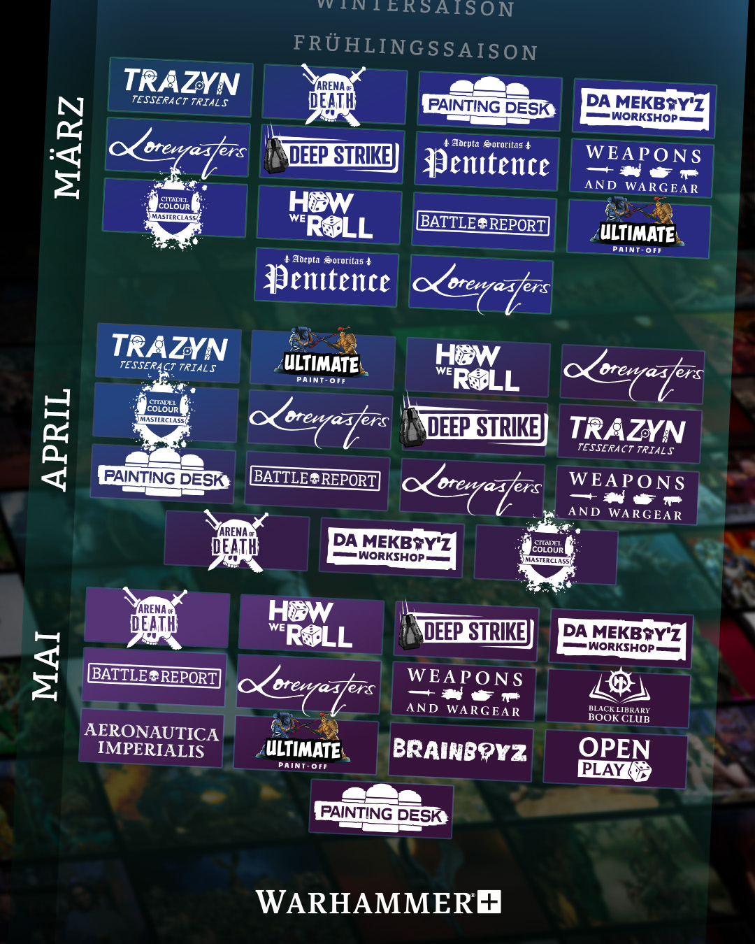 Diese neuen Episoden sind nur eine kleine Auswahl von hunderten von Shows, die du auf Warhammer TV ansehen kannst. Ein Warhammer+-Abo gibt dir Zugang zu einem Primarchen-hohen Stapel von Interviews, Spielberichten, unterhaltsamen Shows und unglaublichen Warhammer-Animationen. Dein Abo erlaubt es dir auch, jedes Jahr eine kostenlose Miniatur zu beanspruchen und Extras wie den Warhammer Vault und erweiterte Optionen für Armeelisten in den Apps für Warhammer 40.000 und Warhammer Age of Sigmar zu beanspruchen. Außerdem kannst du auch jeden Monat Rabatte auf Merch erhalten und noch mehr! Abonniere jetzt!